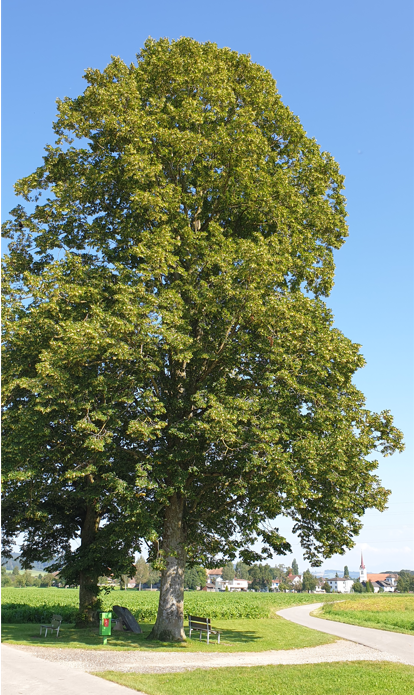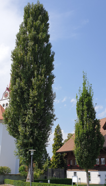 Wie bei der Pappel gibt es auch bei der Eiche eine schlanke Wuchsform, die Säuleneiche. Offenbar stammen alle Säuleneichen in Mitteleuropa von der «Schönen Eiche von Harreshausen» in Hessen ab. Diese natürliche Mutation einer Stieleiche wurde schon im 17. Jahrhundert entdeckt und seither vielfach vegetativ vermehrt und in ganz Europa angepflanzt (Wikipedia). Die Säuleneiche kann ein wunderbares gestalterisches Element im Siedlungsraum sein, beispielsweise wo nicht genug Platz für einen breiten Baum vorhanden ist. Traditionell wurde dafür die Säulenpappel verwendet, dieser brechen aber relativ schnell Äste ab, sodass sie im Siedlungsraum nicht überall geeignet ist.